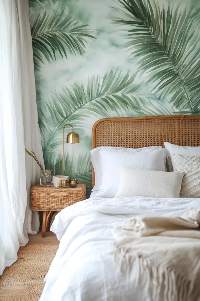 A wallpaper mural instantly transforms a bedroom, turning a blank wall into a stunning focal point.