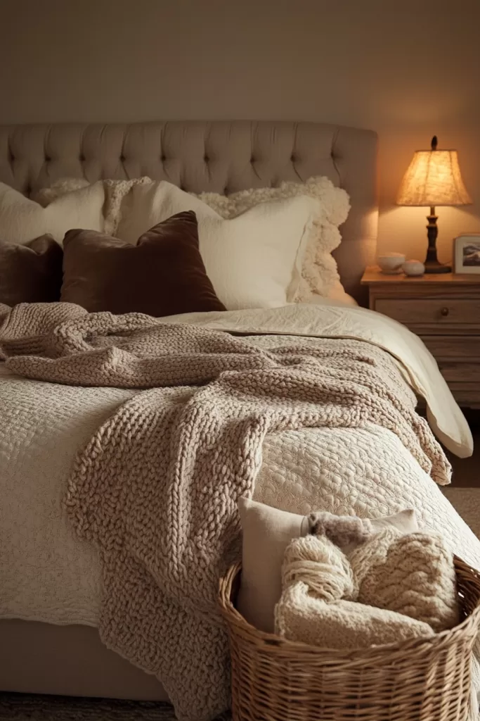 Textured elements like knitted throws, woven baskets, or plush rugs enhance the cozy feel of the space.