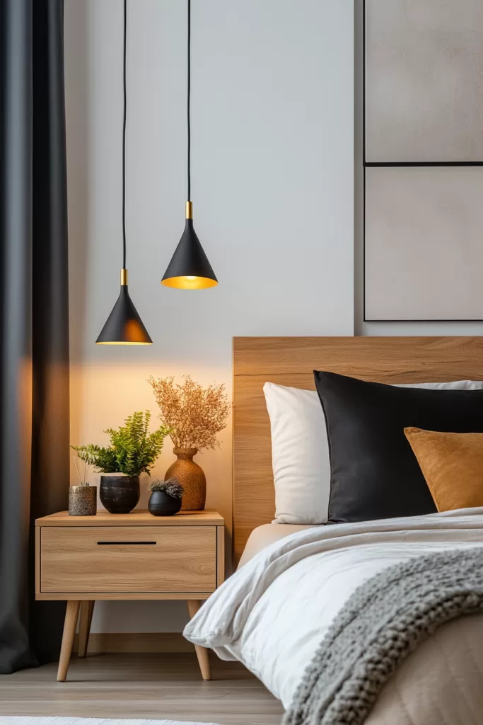 Replace traditional bedside lamps with pendant lights for a chic, contemporary touch.