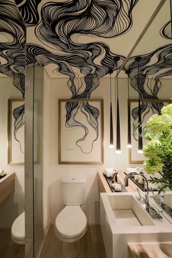 To add personality without overwhelming the space, use patterned wallpaper or a patterned floor on one wall or section.